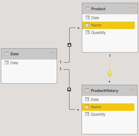 There are two relationships on the Date column and an inactive one on the Name column between Product and ProductHistory. The last relationship is inactive, because otherwise it would create an ambiguity on the propagation of a filter from ‘Date'[Date] to ProductHistory[Date]. What would be the right path to follow? From Date directly to ProductHistory or from Date to Product and then to ProductHistory?