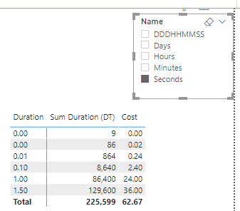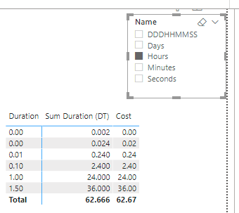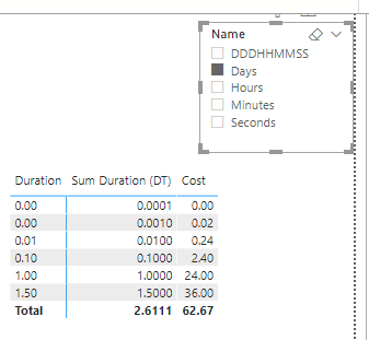 Adding the same test to every calculation item, we are eventually able to use a matrix with both a duration, formatted according to the slicer selection, and a cost, formatted as a decimal number.