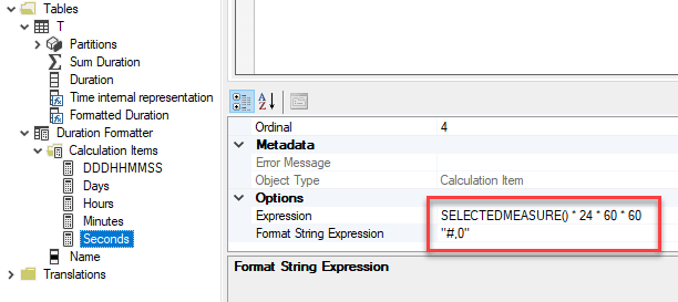 I named it “DDDHHMMSS” and then I wrote the same DAX code as before, just replacing the column reference with the SELECTEDMEASURE() function, and moving the custom format expression to the Format String Expression property