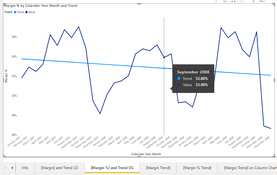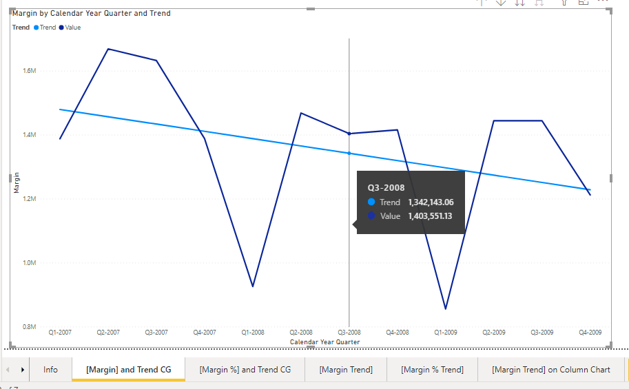 These two measures can be used as the Trend Line measure in the previous post. No calculation group is to be selected for the line chart, but just the [Margin] and the [Margin Trend] measures