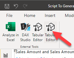 As a first step to create the script, we must run Tabular Editor from the Power BI External Tool Ribbon