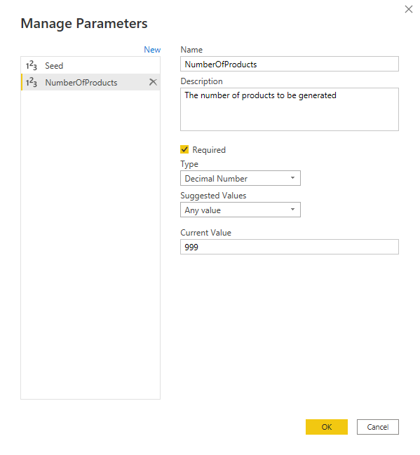 Since the number of products is now a parameter, I also had to change the code that computes the name of the product by replacing the format parameter “000” in the Number.ToText() with a string containing a number of zeroes large enough, that is computed as a separated query PadNumber